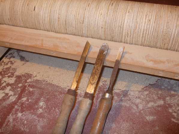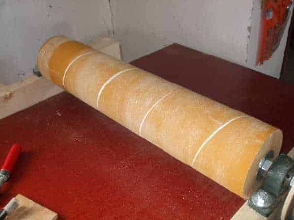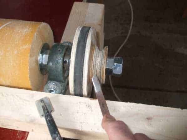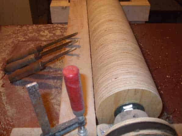 Kezdődhetett a henger felszabályozása. Ehhez ugyanazt a módszert választottam mint az ékszíjtárcsa elkészítéséhez, az az megesztergáltam a hengert a helyén. Egy vezető lécet szorítókkal felrögzítettem a henger elé szorosan majd ezt vezetőként használva már rá tudtam tenni a faeszterga késeket.