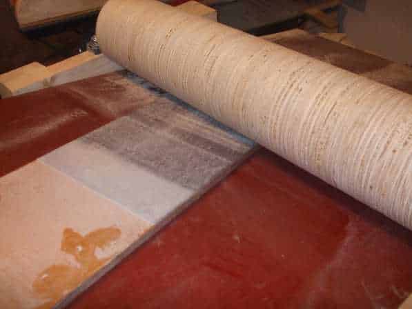 Közben a hengerre kétoldalas öntapadós szalagot ragasztottam átlósan rátekerve, erre pedig a 12 cm széles gépi csiszolószalagból jó pár métert ragasztottam fel szintén átlósan rátekerve a hengerre. Jó sokszor próbálkoztam mire sikerült. Nem volt egyszerű feladat. A tereim szerint tépőzáras csiszolóvásznat szerettem volna venni 10 cm széles tekercsben de több tucat üzlet felkeresése és a neten napokig tartó levelezéssel sem tudtam beszerzési helyet találni. Végül sikerült egy gyártótól árajánlatot kapnom, de eléggé elrettentő ára volt egy 50 m-es tekercsnek. Ezért maradtam inkább a sima gépi csiszolópapír használatánál. A gépet már ki tudtam próbálni, de mivel előre fele forgott a henger az esztergálás miatt ezért nagyon nagy erővel kellett visszafogni a csiszolandó fát a forgó henger alá. Ezért gyorsan átkötöttem a motort, hogy a másik irányba forogjon, így már egy újjal elég volt lazán tolni a munkadarabot a vele szembe forgó henger alá.