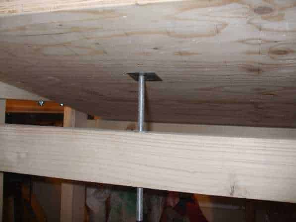 Az elülső gerendát átfúrtam 11-es fúróval, majd egy M10-es talpas anyát ütöttem a lyukba bele felül, ebbe már bele lehetett hajtani a menetes szárat. Egy kis koracél lemezből készült kockát ragasztottam az asztallap aljára, hogy erre támaszkodjon fel a menetes szár.